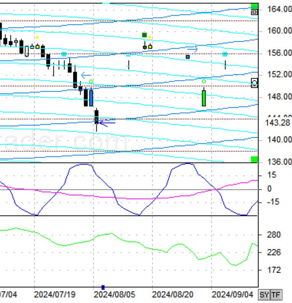 引用:アストロチャートより ドル/円 日経平均 9月にかけて、星達は、中断から上へ